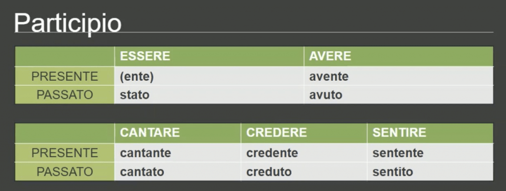 از این افعال برای ساختن زمان های مرکب tempi composti استفاده می شود . در راستای آموزش زبان ایتالیایی برای ساختن این Participio از قانون زیر برای افعال با قاعده پیروی می کنیم.